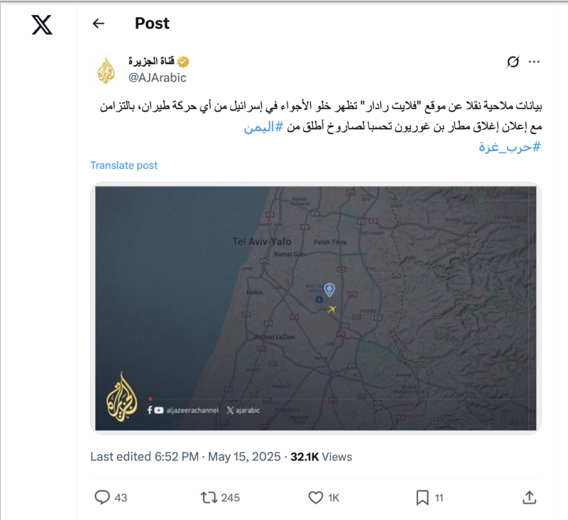 نشرت قناة الجزيرة القطرية على منصاتها في فيسبوك وإكس (تويتر سابقًا) صورة مأخوذة من أداة تعقّب الطيران "فلايت رادار" تُظهر أجواء إسرائيل خالية من الطيران بعد إطلاق صاروخ من اليمن، ونقلت العديد من الحسابات ما نشرته الجزيرة.