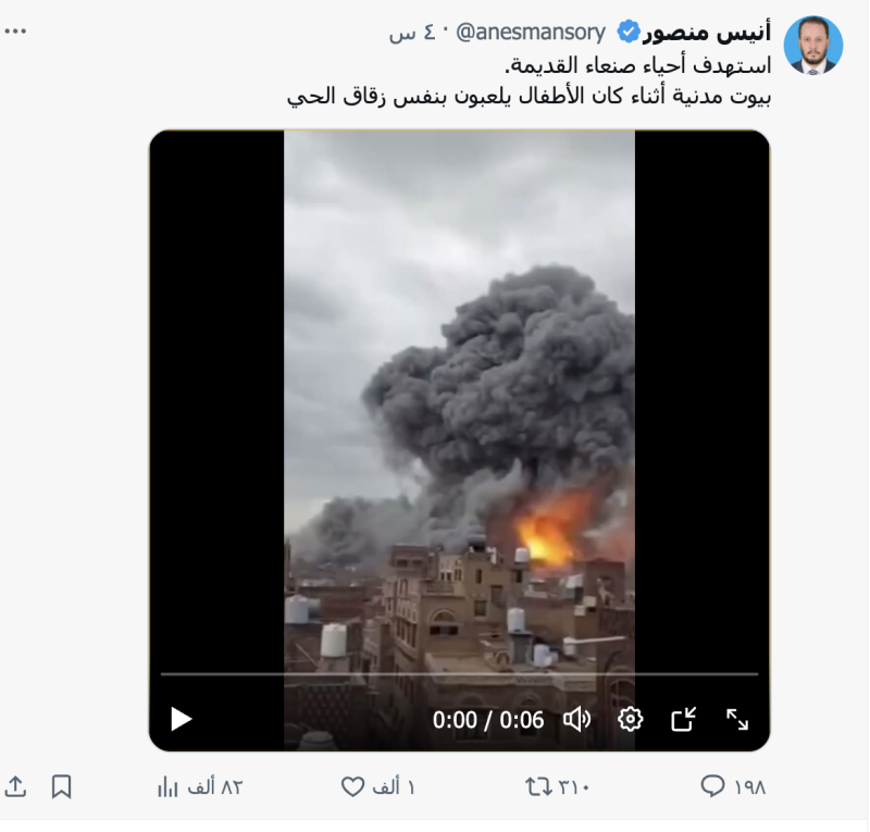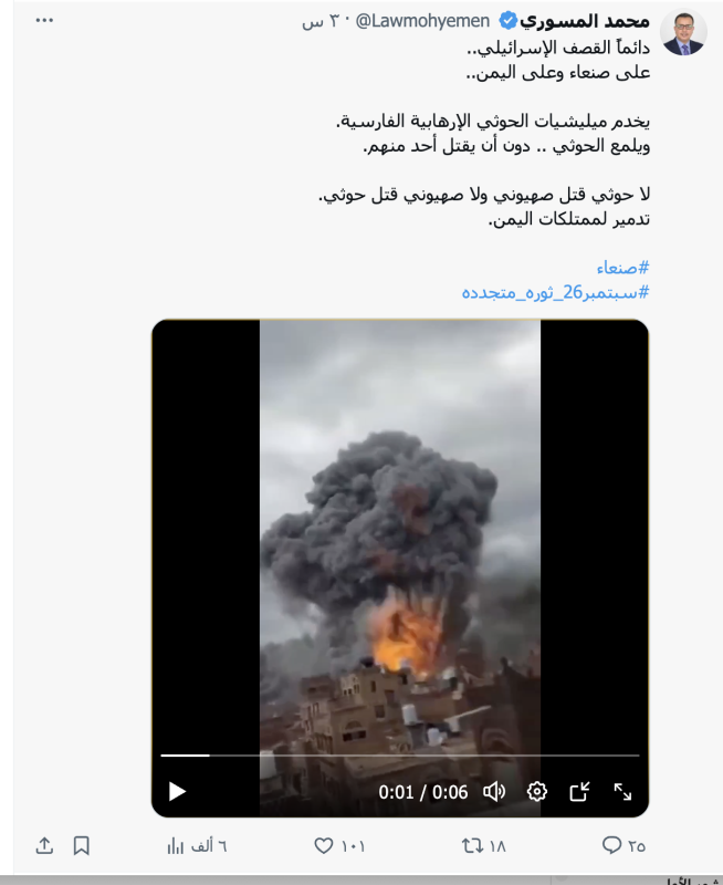 تداول ناشطون وحسابات على منصات إكس مقطع فيديو أدعت أنه من القصف الإسرائيلي الأخير على صنعاء اليوم