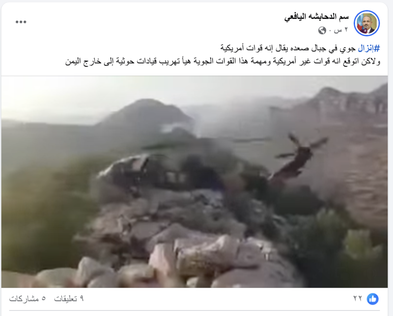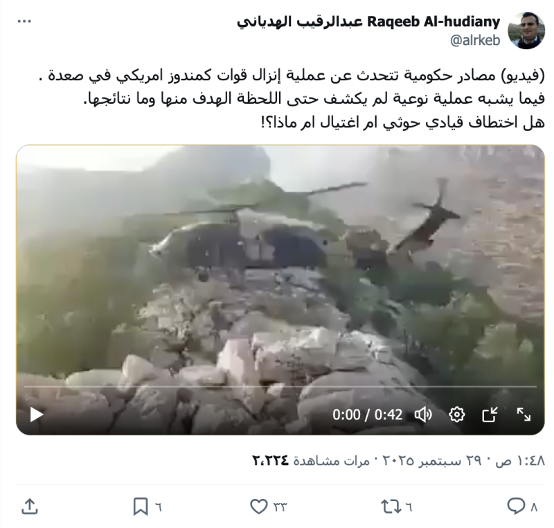 تداولت حسابات وصفحات على منصات "إكس" وفيس بوك اليوم الإثنين (٢٩ سبتمبر٢٠٢٥)، مقطع فيديو زُعم أنه يوثق عملية إنزال لقوات كوماندوز أمريكية في محافظة صعدة شمالي اليمن.