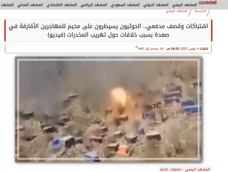 نشرت مواقع الكترونية وحسابات على منصات التواصل الاجتماعي فيديو ادعت أنه يظهر قصفا حوثيا على مخيم للمهاجرين الافارقة في صعدة على الحدود اليمنية السعودية.