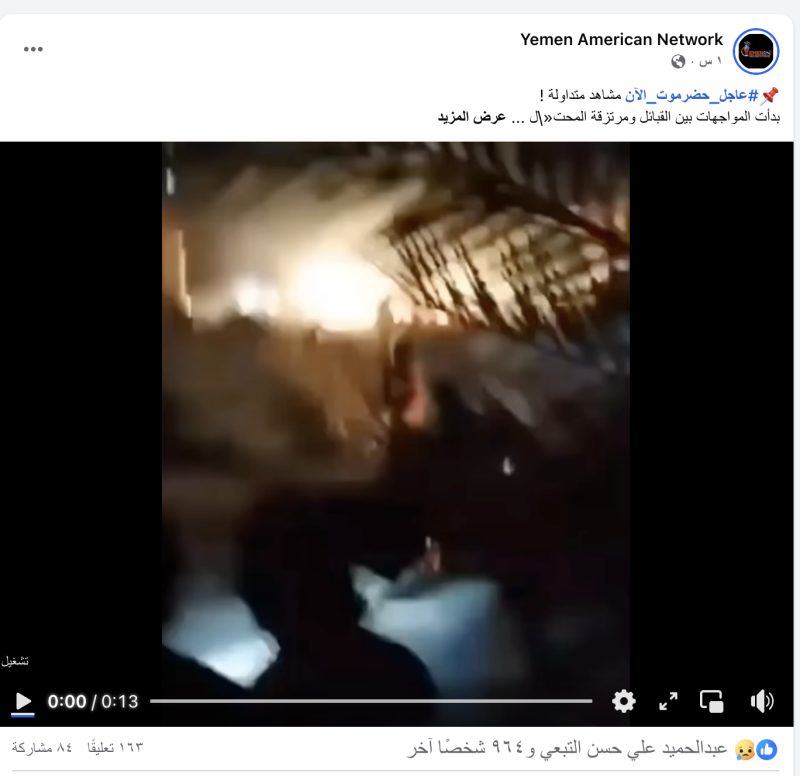 نشرت حسابات وصفحات على منصة التواصل الاجتماعي فيس بوك مقطع فيديو مدعية أنه يوثق بدأ المواجهات بين القبائل في حضرموت والانتقالي الجنوبي.