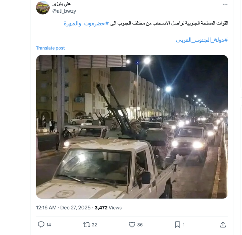 نشرت حسابات على منصة إكس صورة ادعت أنها لقوات الانتقالي الجنوبي تتجه من محافظات الجنوب إلى حضرموت والمهرة