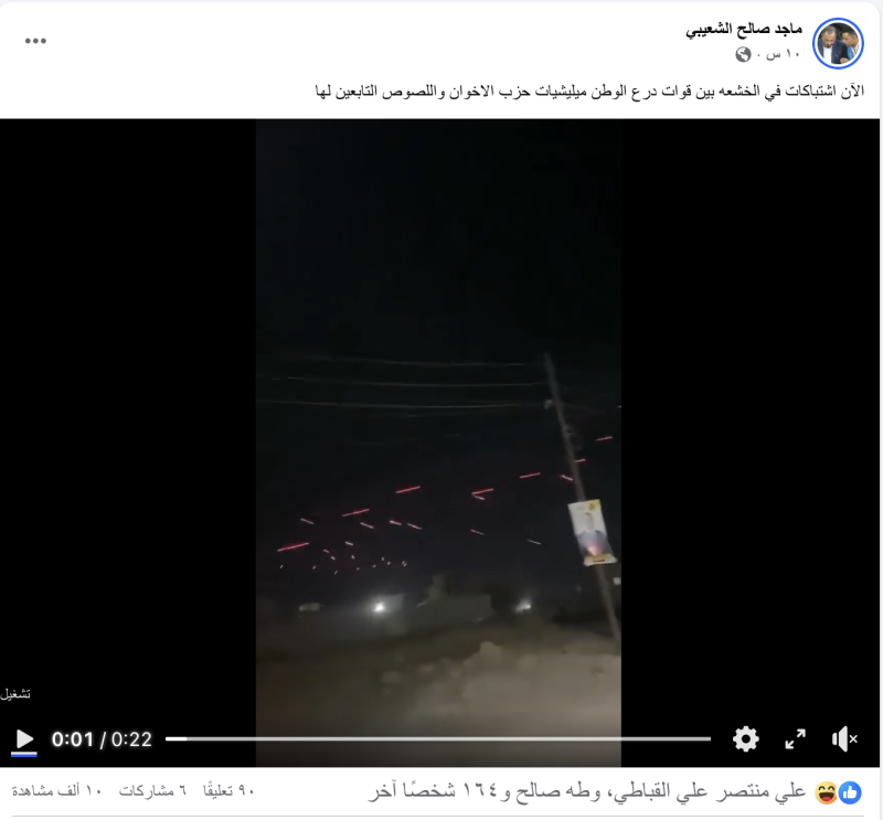 نشرت حسابات وصفحات على منصات التواصل الاجتماعي مقطع فيديو مدعية أنه يوثق راهنا اشتباكات في الخشعه بين قوات درع الوطن وقوات قادمة من المحافظات الشمالية