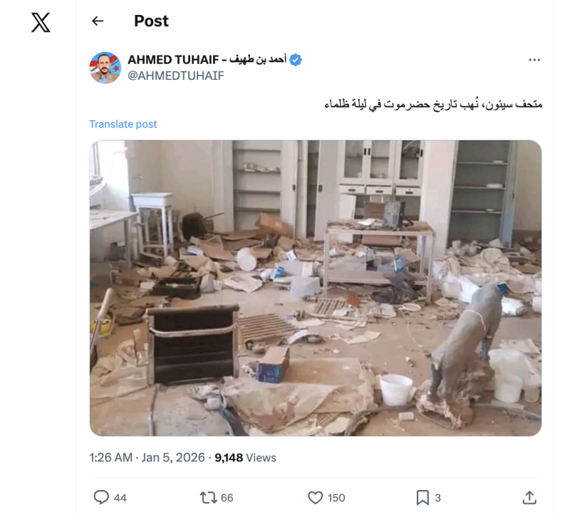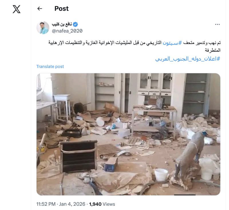 نشرت حسابات وصفحات على منصات التواصل خلال الساعات الماضية صورة زعمت أنها لنهب وتدمير متحف سيئون التاريخي من قبل قوات قادمة من المحافظات الشمالية