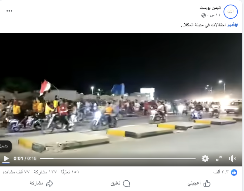 نشرت حسابات وصفحات على منصات التواصل الاجتماعي مقطع فيديو مدعين أنه احتفال ابناء حضرموت بتحرير من المجلس الانتقالي