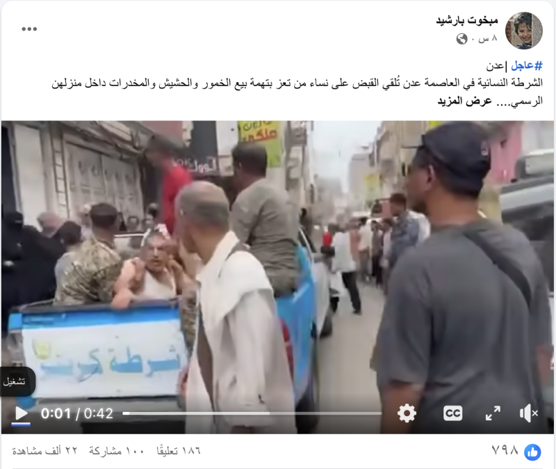 نشرت حسابات وصفحات على منصات التواصل الاجتماع مقطع فيديو زعمت أنه لقيام الشرطة النسائية في العاصمة عدن بالقبض على نساء من تعز بتهمة بيع الخمور والحشيش والمخدرات داخل منزلهن الرسمي