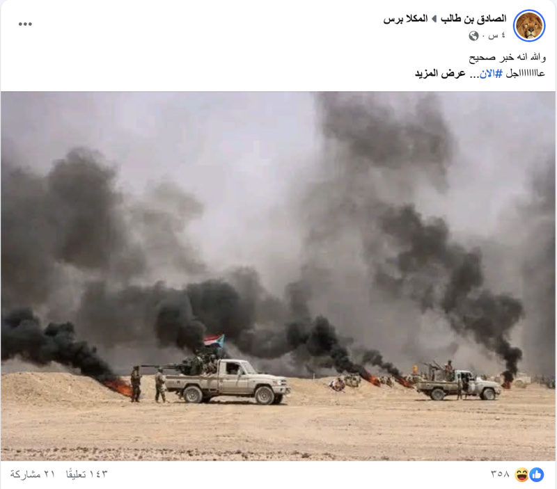نشرت حسابات وصفحات على منصات التواصل الاجتماعي خبرا عن زعمت فيه حدوث اشتباكات في وادي حضرموت واحراق 5 مدرعات و13 طقما عسكريا ، وأسر اكثر من 30 شخص بينهم قائد كبير
