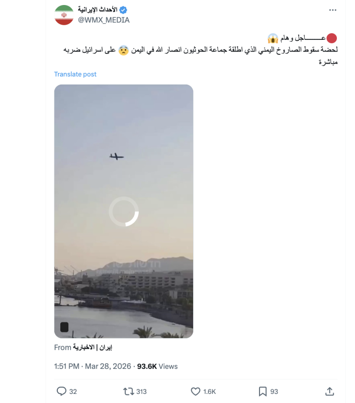 نشرت حسابات وصفحات على منصات التواصل الاجتماعي مقطع فيديو  مدعية أنه يوثق لحظة سقوط الصاروخ الذي أطلقته جماعة الحوثيون  على اسرائيل اليوم  السبت 28 مارس 2026
