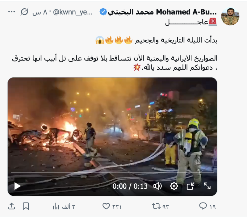 نشرت حسابات وصفحات على منصات التواصل الاجتماعي   مقطع فيديو  مدعية أنه لهجوم صاروخي إيراني يمني على تل أبيب في بداية اليوم معلقين عليه  بالقول «  الليلة التي حُذرت منها..تل أبيب تحترق" .