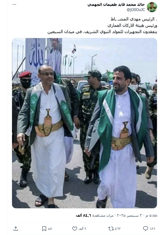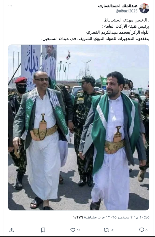 تداولت حسابات وصفحات على منصات التواصل الاجتماعي صورة لرئيس المجلس السياسي التابع لجماعة الحوثيين مهدي المشاط ورئيس أركان الجماعة محمد الغماري، زاعمة أنها التقطت صباح الأربعاء 3 سبتمبر خلال تفقدهما تجهيزات الاحتفال بالمولد النبوي في ميدان السبعين بصنعاء.