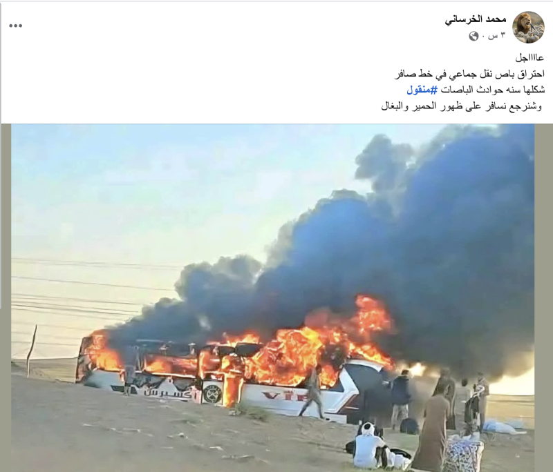 نشرت حسابات على منصة التواصل الاجتماعي فيس بوك صورة مدعين أنها لاحتراق حافلة نقل جماعي في طريق صافر محافظة مأرب حديثا.
