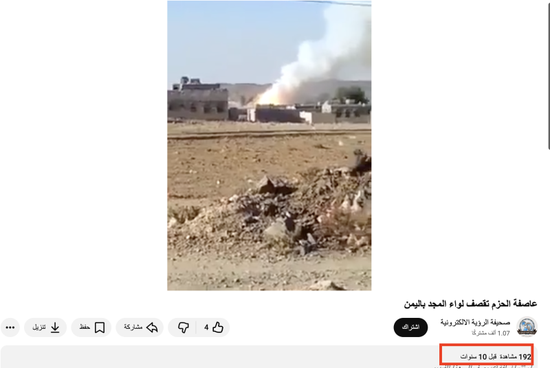 تحقق يوب يوب من الإدعاء وتبين أنه مضلل إذا أظهرت علمية البحث العكسي عن لقطة ثابتة من المقطع أنه قديم ونشر للمرة الأولى في أبريل 2015 ضمن سياق " قصف طيران التحالف العربي على لواء المجد التابع لجماعة الحوثي في مكيراس" .