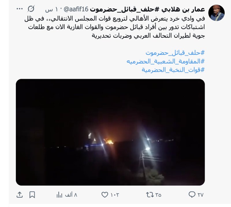 يأتي تداول الادعاء بالتزامن مع ورد أنباء عن تعرض مواقع تابعة للمجلس الانتقالي في حضرموت لغارات جوية بواسطة الطيران السعودي