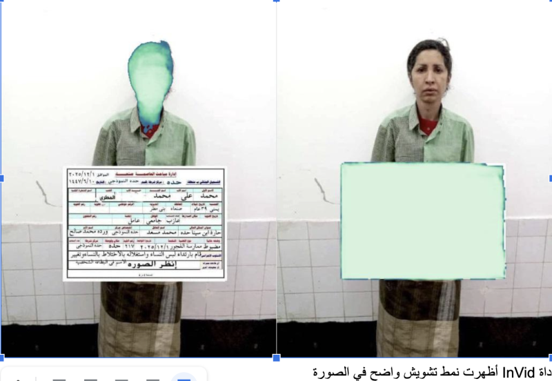 تحققنا في يوب يوب من الادعاء وتبين أنه مضلل، إذ أظهرت أدوات التحليل الجنائي، بما فيها أداة InVid بنسختها المتقدمة، وأداة Mever، وجود نمط لتشويش واضح في مناطق مُختلفة، حيث كشفت خوارزمية TruFor عن المناطق التي تم التلاعب بها بصريًا في الصورة، حيث تبرز المناطق المُعدّلة باللون الأخضر في InVid والأحمر في Mever، مما يشير إلى أن الصورة مركَّبة وليست أصلية.