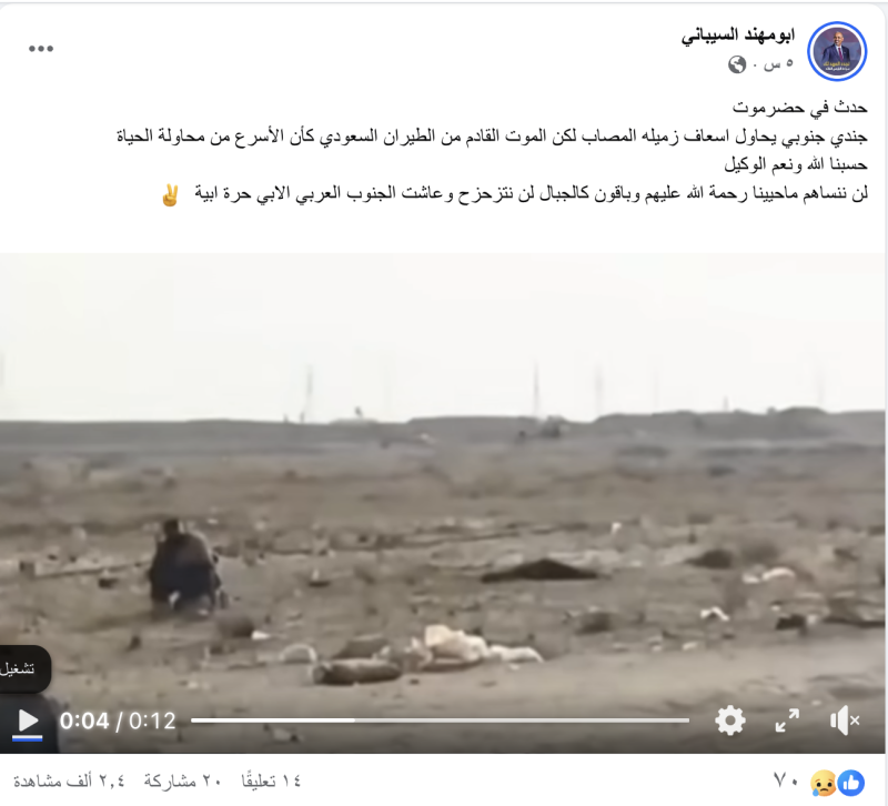 نشرت حسابات وصفحات على منصات التواصل الاجتماعي إكس وفيس بوك مقطع فيديو مدعية أنه يظهر استهداف الطيران السعودي لجندي جنوبي كان يحاول إسعاف زميله المصاب بغارة سابقة في حضرموت.