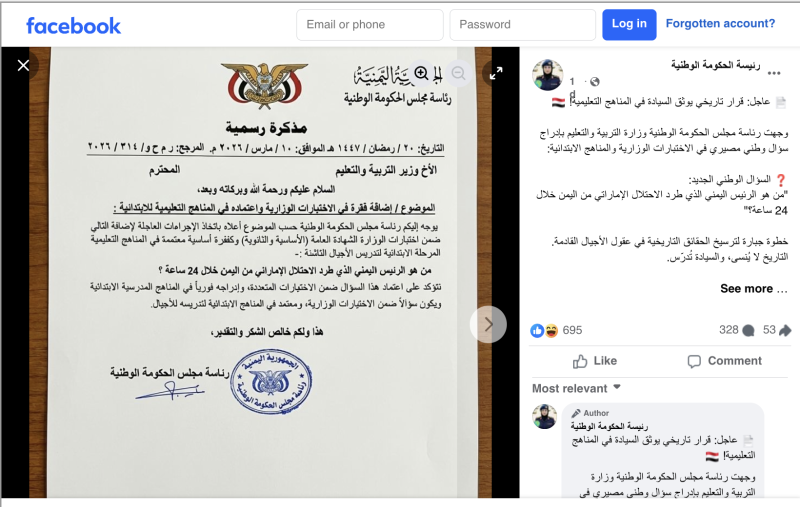 نشرت صفحات على منصة فيسبوك صورة وثيقة مدعية أنها صادرة عن رئيس مجلس الوزراء اليمني شائع الزنداني ، موجهة إلى وزير التربية والتعليم بخصوص الرئيس الذي طرد الاحتلال الإماراتي من اليمن .