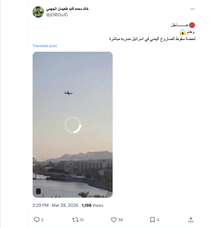 نشرت حسابات وصفحات على منصات التواصل الاجتماعي مقطع فيديو مدعية أنه يوثق لحظة سقوط الصاروخ الذي أطلقته جماعة الحوثيون على اسرائيل اليوم السبت 28 مارس 2026