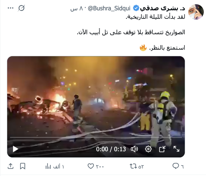 نشرت حسابات وصفحات على منصات التواصل الاجتماعي مقطع فيديو مدعية أنه لهجوم صاروخي إيراني يمني على تل أبيب في بداية اليوم معلقين عليه بالقول « الليلة التي حُذرت منها..تل أبيب تحترق" .