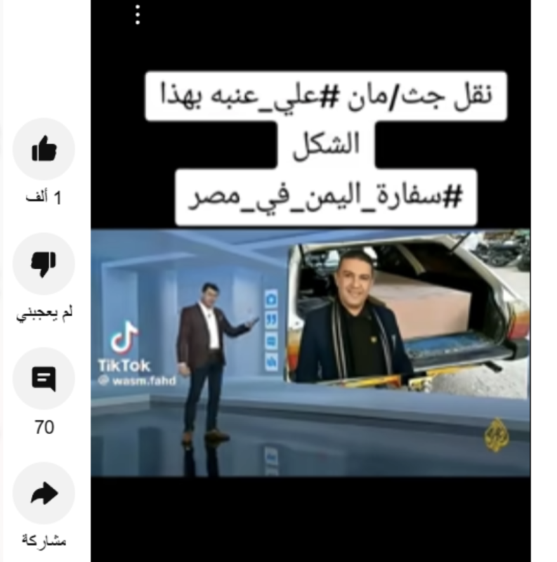 تداولت حسابات على منصتي فيسبوك ويوتيوب مقطع فيديو زعمت أنه من برنامج شبكات الذي تبثه قناة الجزيرة، يظهر فيه المذيع أحمد فاخوري يتناول استياء اليمنيين من نقل جنازة الفنان علي عنبة في سيارة قديمة.