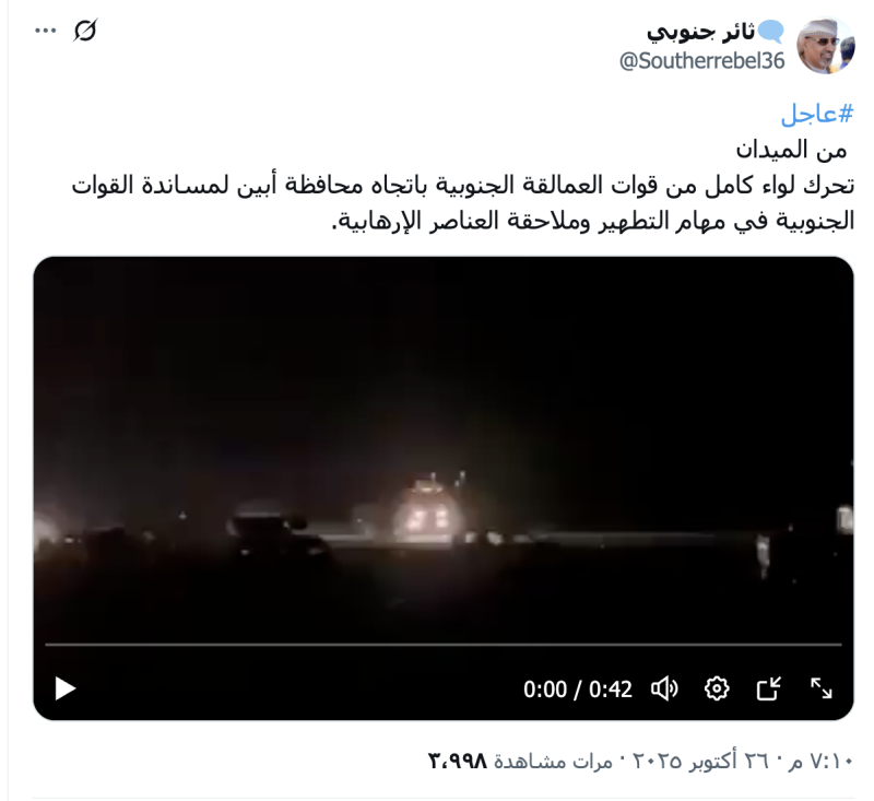 نشرت حسابات على منصة إكس مقطع فيديو ادعت أنها تحرك لواء كامل من قوات العمالقة نحو محافظة أبين لمكافحة حالة التوتر التي حصلت مؤخرا.