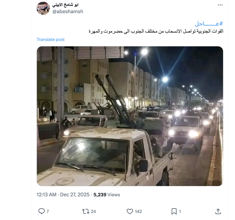 نشرت حسابات على منصة إكس صورة ادعت أنها لقوات الانتقالي الجنوبي تتجه من محافظات الجنوب إلى حضرموت والمهرة