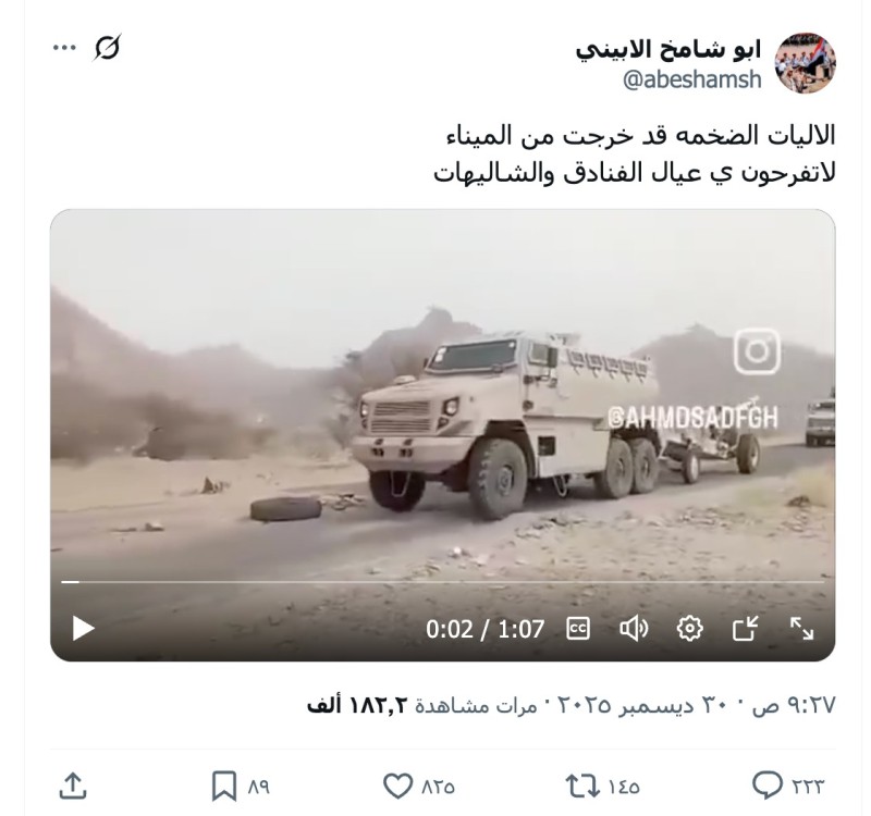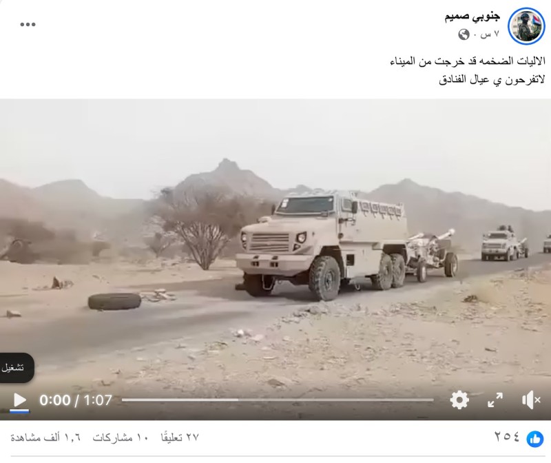 تداولت حسابات على منصات التواصل الاجتماعي «فيسبوك» و«إكس» مقطع فيديو زعمت أنه يُظهر خروج آليات عسكرية ضخمة من الميناء بهدف دعم قوات المجلس الانتقالي الجنوبي في محافظة حضرموت.