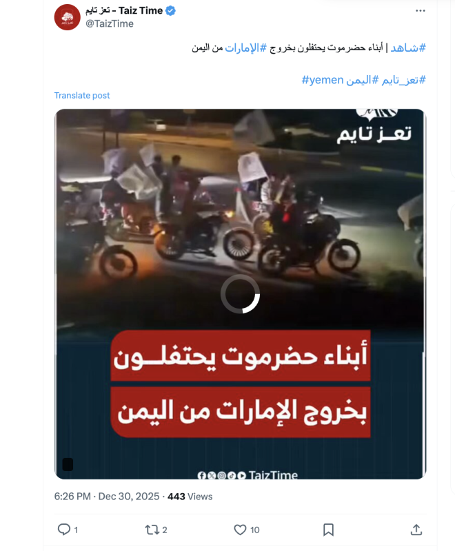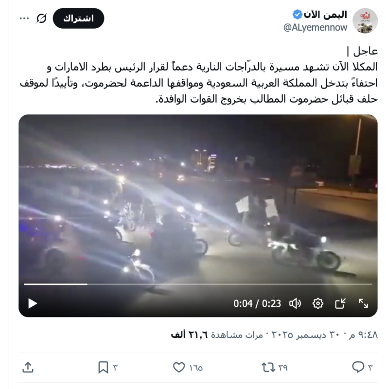 نشرت حسابات على موقع التواصل الاجتماعي اكس فيديو ادعت انه لاحتفال أبناء حضرموت بخروج الإمارات من اليمن