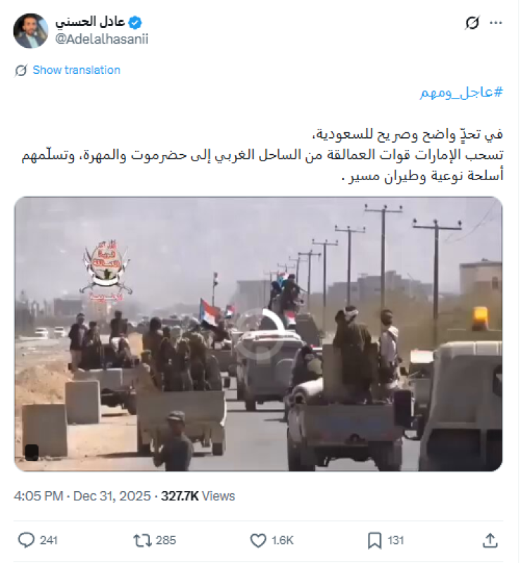 ويأتي تداول هذا الادعاء عقب إعلان رئيس مجلس القيادة الرئاسي منح دولة الإمارات مهلة 24 ساعة لسحب قواتها من اليمن، وخروج قوات المجلس الانتقالي الجنوبي من حضرموت والمهرة.