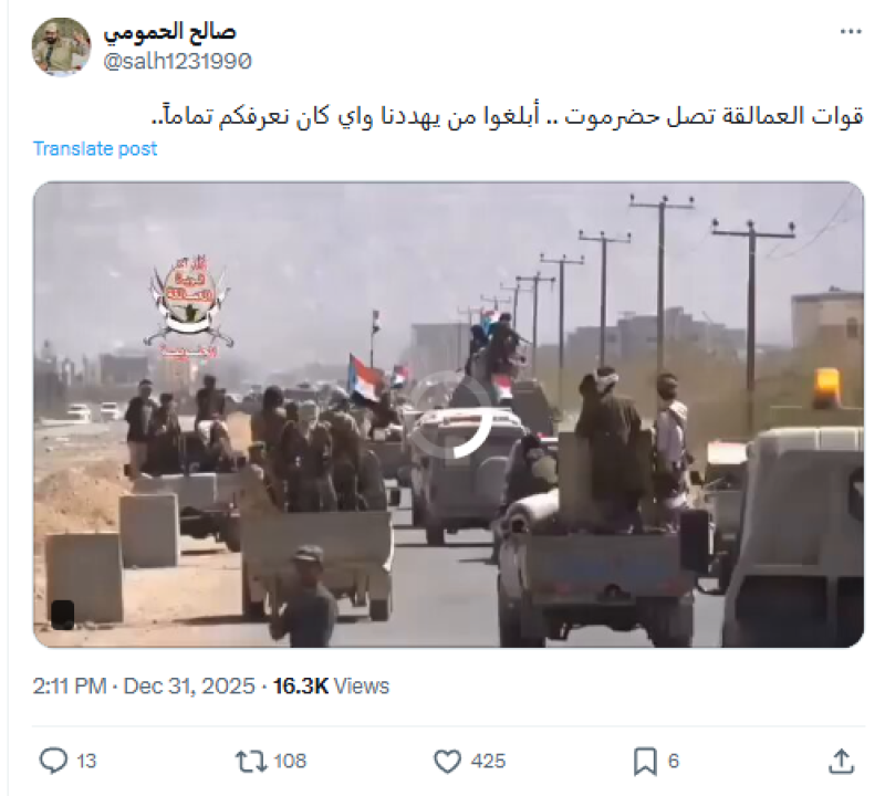 نشرت حسابات على منصة «إكس»، مقطع فيديو زعمت أنه يُظهر تعزيزات عسكرية لقوات ألوية العمالقة في طريقها إلى محافظتي حضرموت والمهرة شرقي اليمن.