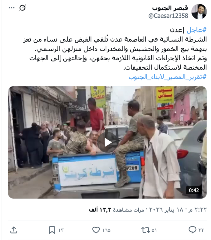 نشرت حسابات وصفحات على منصات التواصل الاجتماع مقطع فيديو زعمت أنه لقيام الشرطة النسائية في العاصمة عدن بالقبض على نساء من تعز بتهمة بيع الخمور والحشيش والمخدرات داخل منزلهن الرسمي