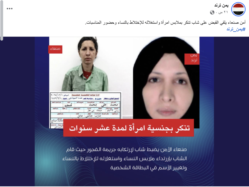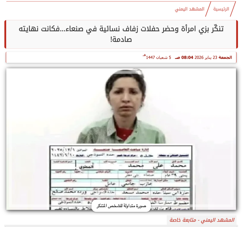 تداولت مواقع إخبارية وحسابات على موقعي التواصل الاجتماعي، فيسبوك وإكس ، صورة، مدعين أنها لشاب تنكر بزي امرأة، قبل أن يتم ضبطه بتهمة حضور حفلات الزفاف النسائية في صنعاء.