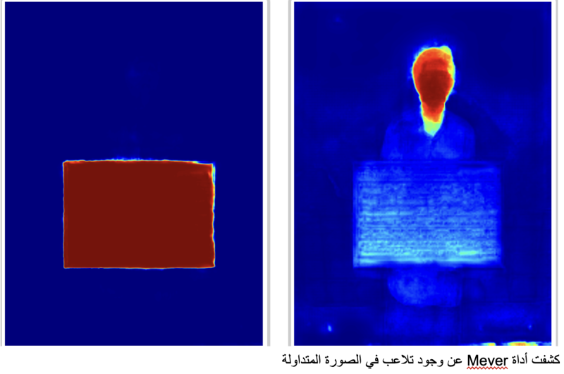 تحققنا في يوب يوب من الادعاء وتبين أنه مضلل، إذ أظهرت أدوات التحليل الجنائي، بما فيها أداة InVid بنسختها المتقدمة، وأداة Mever، وجود نمط لتشويش واضح في مناطق مُختلفة، حيث كشفت خوارزمية TruFor عن المناطق التي تم التلاعب بها بصريًا في الصورة، حيث تبرز المناطق المُعدّلة باللون الأخضر في InVid والأحمر في Mever، مما يشير إلى أن الصورة مركَّبة وليست أصلية.