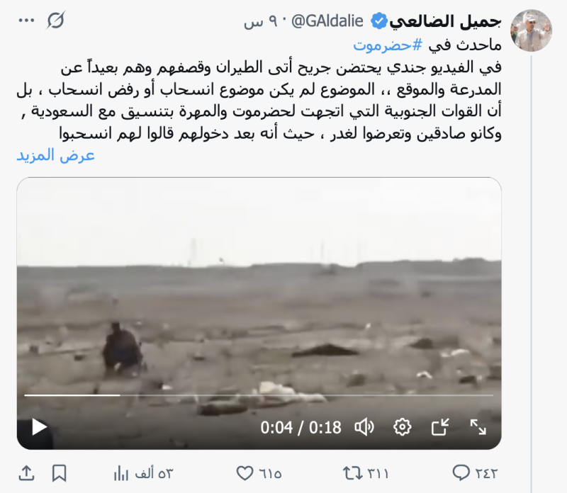 نشرت حسابات وصفحات على منصات التواصل الاجتماعي إكس وفيس بوك مقطع فيديو مدعية أنه يظهر استهداف الطيران السعودي لجندي جنوبي كان يحاول إسعاف زميله المصاب بغارة سابقة في حضرموت.