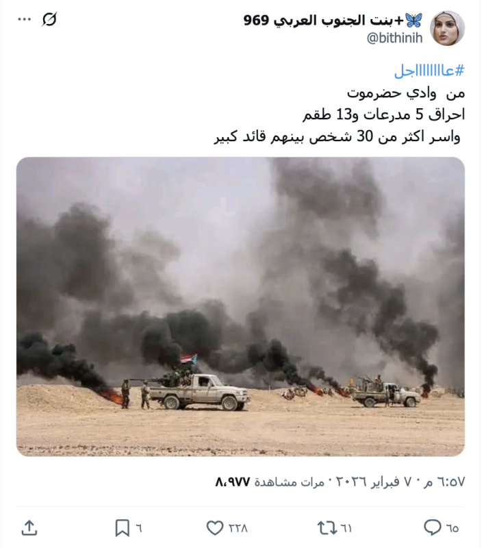نشرت حسابات وصفحات على منصات التواصل الاجتماعي خبرا عن زعمت فيه حدوث اشتباكات في وادي حضرموت واحراق 5 مدرعات و13 طقما عسكريا ، وأسر اكثر من 30 شخص بينهم قائد كبير