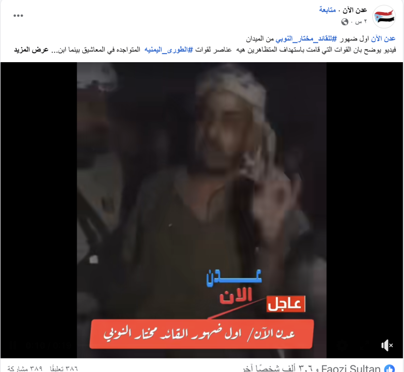 نشرت حسابات وصفحات على منصات التواصل مقطع فيديو مدعية أنه لظهور القائد في القوات التابعة للانتقالي الجنوبي فجر اليوم