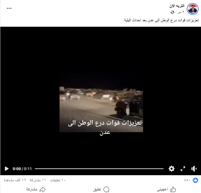 نشرت حسابات وصفحات على منصات التواصل مقطع فيديو مدعياً بأنه تعزيزات قوات درع الوطن و الطوارئ الى عدن.