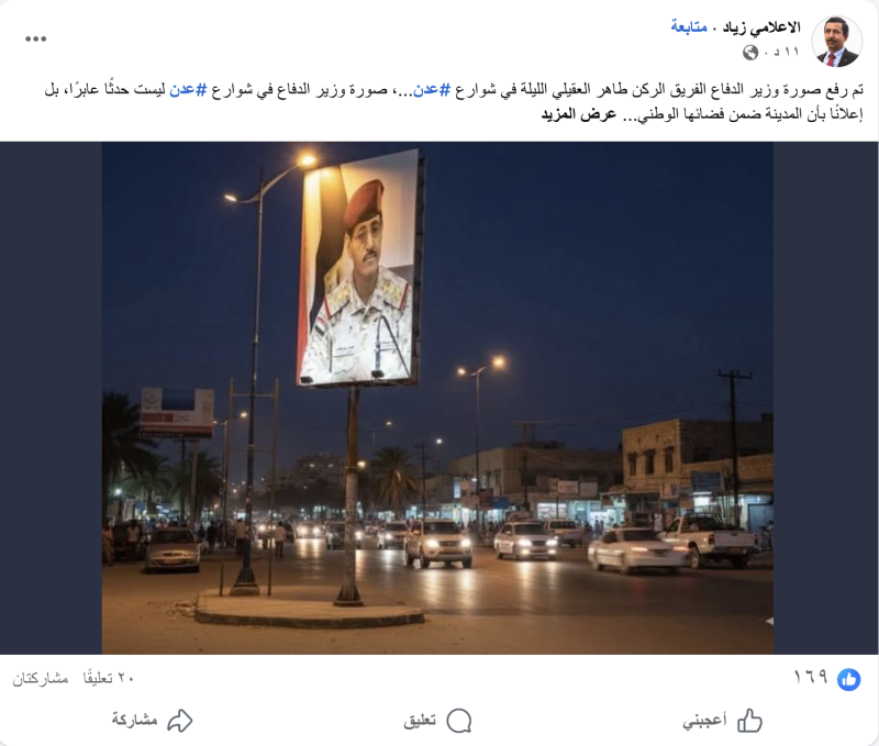 نشرت حسابات على التواصل الاجتماعي صورة ادعت أنها تظهر رفع صورة وزير الدفاع في الحكومة اليمنية الجديدة الفريق الركن طاهر العقيلي الليلة في شوارع عدن استفزازا لأبناء عدن المطالبين بخروجه من المدينة