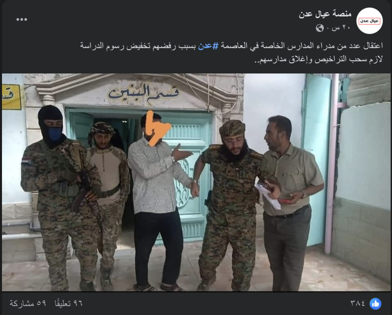 تداول ناشطون على منصة فيسبوك صورة زاعمين أنها لقيام قوات من أمن عدن بتنفذ حملة اعتقالات لمدراء المدارس الخاصة لرفضهم تخفيض رسوم الدراسة .