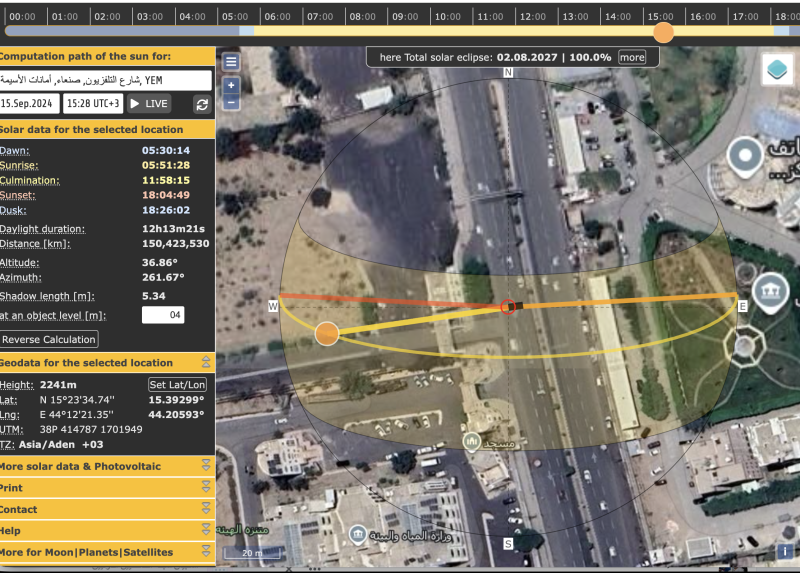استخدمنا أداة suncalc - أداة تحليل موقع الظلال والشمس-، والتي كشفت أن الفيديو صور فعليا بين الساعة الواحدة والثالثة ظهرا يوم الأحد 15 سبتمبر 2024 في شارع التلفزيون بالقرب من شركة يمن موبايل، والذي يصادف 12 ربيع الأول 1446، ما يفسر انتشار اللافتات الخاصة بالمولد النبوي على اللوحات الدعائية وعلى جدران وبوابة شركة يمن موبايل (حجم الظل في الصورة الدائرة الصفراء، وهو ما يؤكد أن المقطع قديم وليس له علاقة بالادعاء المتداول حاليا