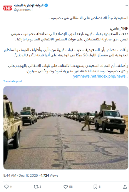 تداولت حسابات مواقع إخبارية على منصة «إكس» صورة زعمت أنها توثق تحركات عسكرية سعودية قادمة من محافظتي مأرب والجوف، في إطار استعداد لمواجهة قوات المجلس الانتقالي الجنوبي في حضرموت.
