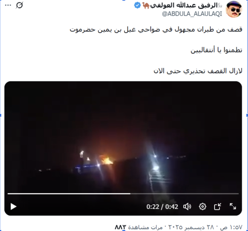 نشرت حسابات وصفحات على منصات التواصل الاجتماعي فيس بوك وإكس مقطع فيديو، زعمت أنه لغارة نفذها الطيران السعودي على تجمعات لقوات المجلس الانتقالي الجنوبي في حضرموت.