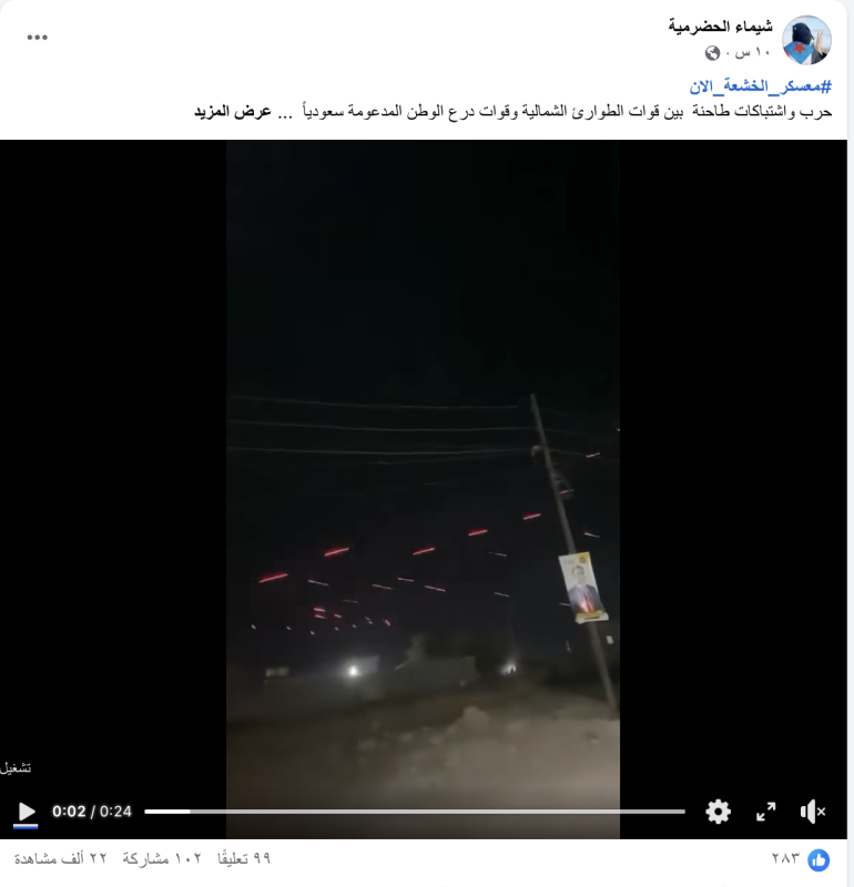 نشرت حسابات وصفحات على منصات التواصل الاجتماعي مقطع فيديو مدعية أنه يوثق راهنا اشتباكات في الخشعه بين قوات درع الوطن وقوات قادمة من المحافظات الشمالية