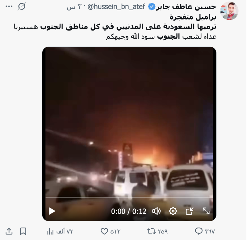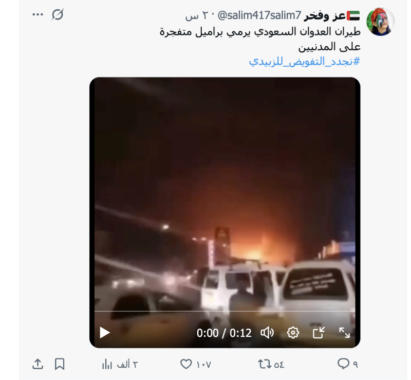 نشرت حسابات وصفحات على منصات التواصل الاجتماعي مقطع فيديو ادعت أنه لقيام الطيران الحربي السعودي برمي براميل متفجرة فوق مناطق الجنوب
