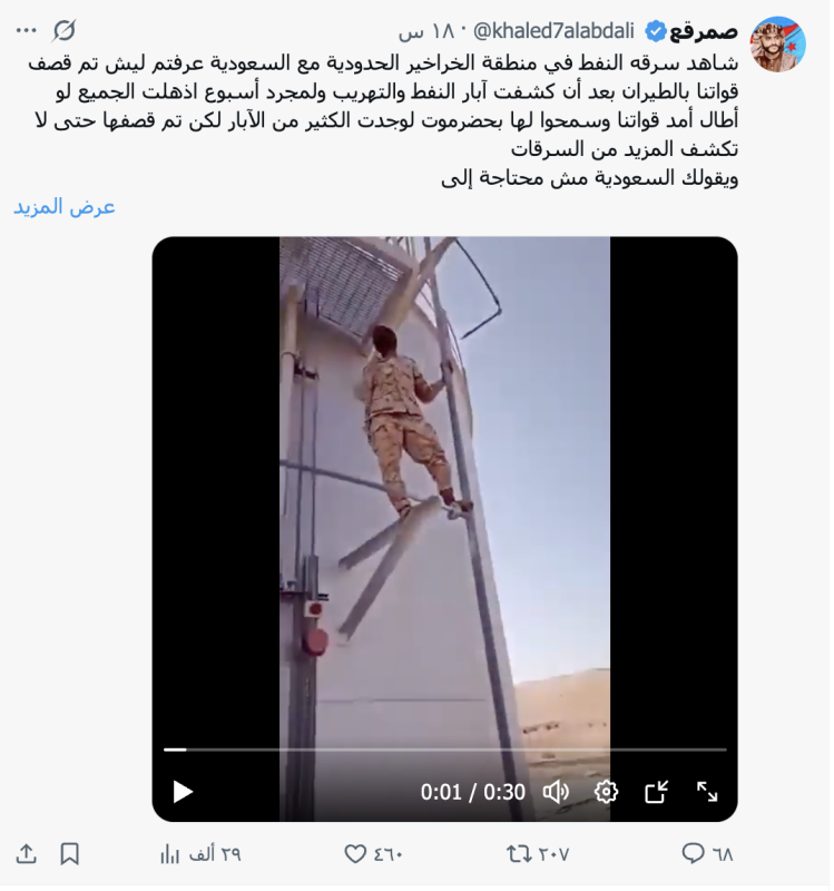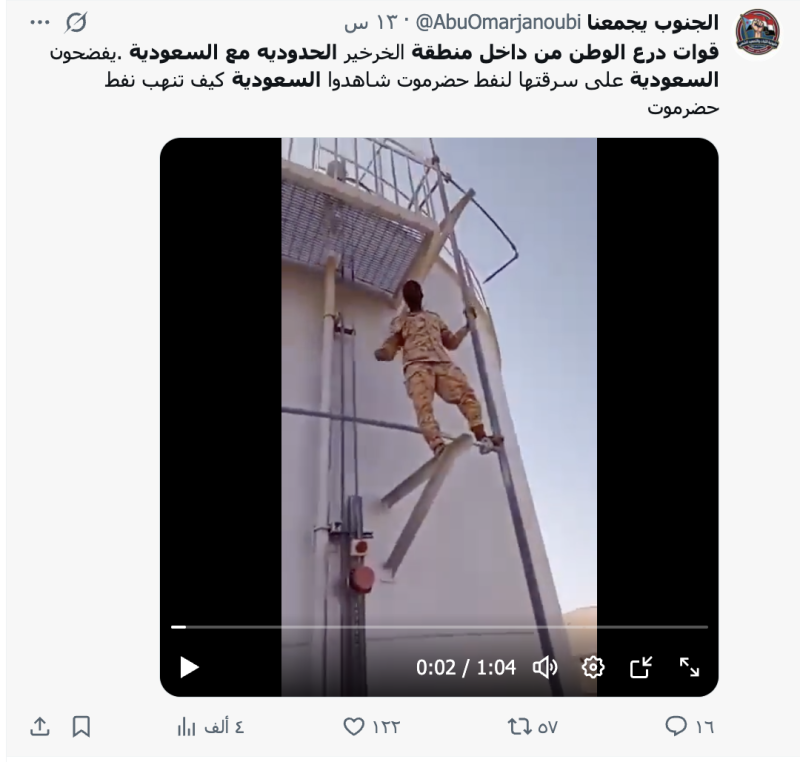 نشرت حسابات وصفحات على منصة إكس مقطع فيديو مدعية أنه يظهر منشاة نفطية في منطقة الخراخير الحدودية مع السعودية لسرقة نفط حضرموت وثقة جندي في قوات درع الوطن.