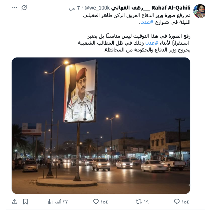 نشرت حسابات على التواصل الاجتماعي صورة ادعت أنها تظهر رفع صورة وزير الدفاع في الحكومة اليمنية الجديدة الفريق الركن طاهر العقيلي الليلة في شوارع عدن استفزازا لأبناء عدن المطالبين بخروجه من المدينة