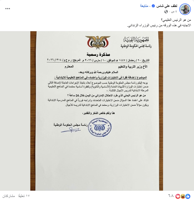 نشرت صفحات على منصة فيسبوك صورة وثيقة مدعية أنها صادرة عن رئيس مجلس الوزراء اليمني شائع الزنداني ، موجهة إلى وزير التربية والتعليم بخصوص الرئيس الذي طرد الاحتلال الإماراتي من اليمن .
